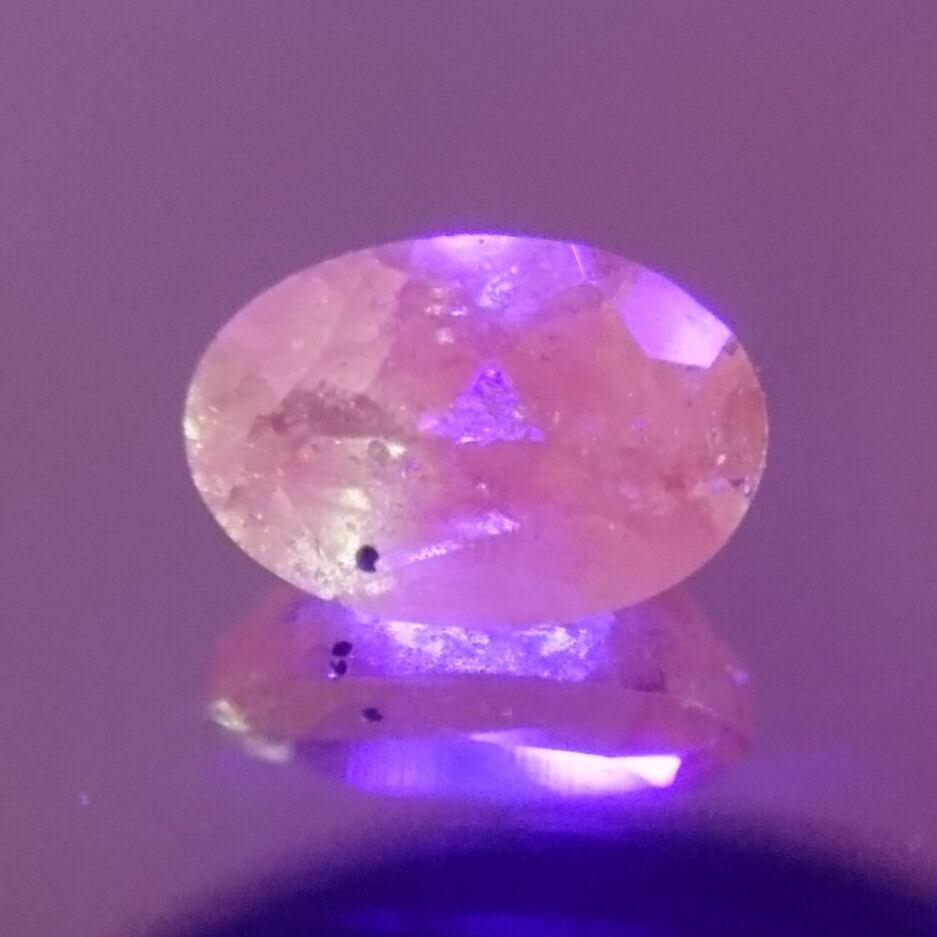 ミントガーネットは蛍光性を有しているものがあり、こちらのルースもUVライトでピンクに蛍光します。